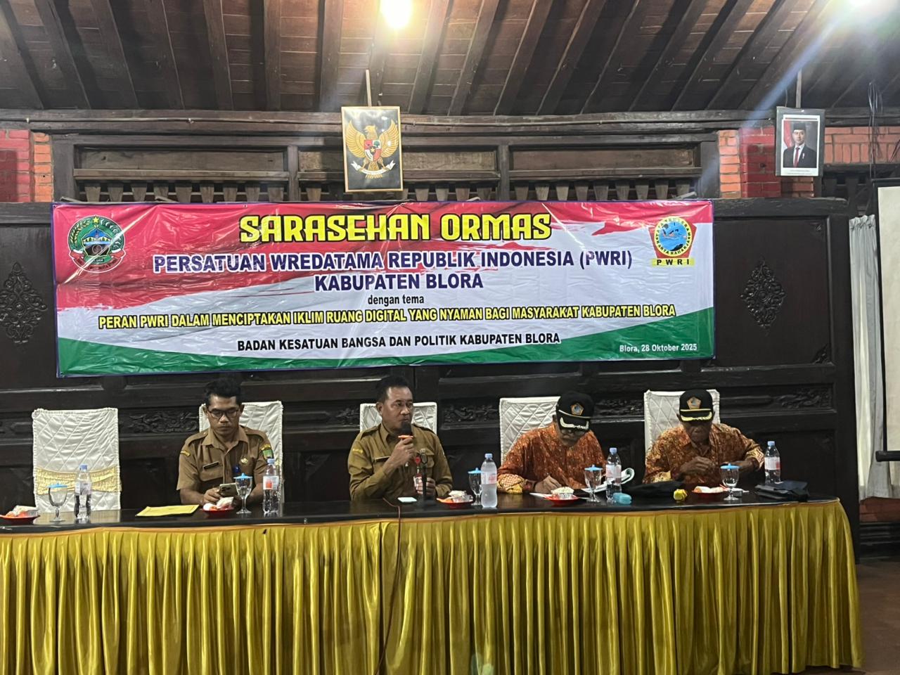 Peran Persatuan Wredatama Republik Indonesia (PWRI) dalam menciptakan iklim ruang digital yang nyaman bagi masyarakat Kabupaten Blora menjadi tema penting yang diusung Badan Kestuan Bangsa dan Politik (Bakesbangpol) saat menggelar sarasehan di resto D’joglo, Blora, Selasa (28/10/2025).