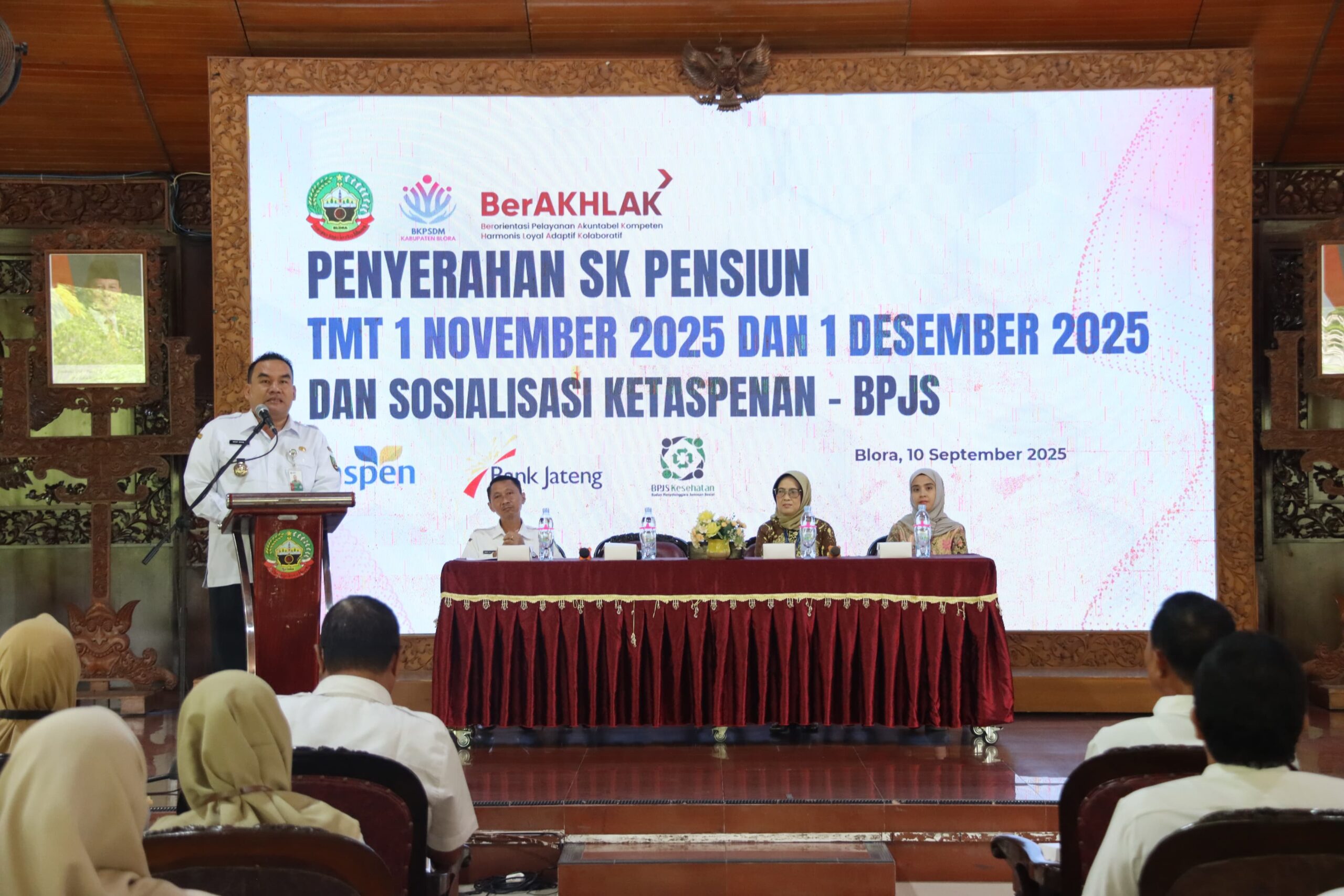 Bupati Blora, Dr. H. Arief Rohman, secara langsung menyerahkan SK Pensiun tersebut. Dia menyampaikan rasa bangga sekaligus haru atas pengabdian para PNS yang telah mendedikasikan diri sepenuh hati untuk melayani masyarakat dan mengawal pembangunan di Kabupaten Blora.