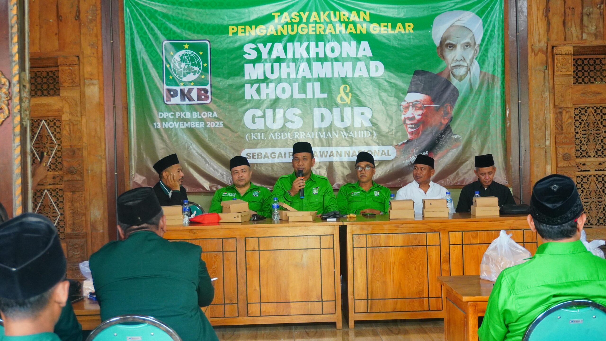Blora, – Dewan Pimpinan Cabang Partai Kebangkitan Bangsa (DPC PKB) Kabupaten Blora menggelar tasyakuran sebagai bentuk rasa syukur dan kebanggaan atas ditetapkannya KH. Abdurrahman Wahid (Gus Dur) sebagai Pahlawan Nasional. Acara berlangsung khidmat di kantor DPC PKB Blora pada Kamis (13/11/2025).