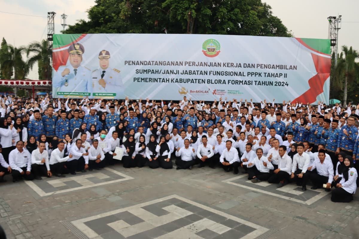 Hal tersebut diungkap Bupati saat memimpin jalannya prosesi penandatanganan perjanjian kerja dan pengambilan sumpah/ janji jabatan fungsional untuk 1.535 PPPK Kabupaten Blora tahap II formasi tahun 2024, Jumat (17/10/2025) di Alun-Alun Kabupaten Blora.