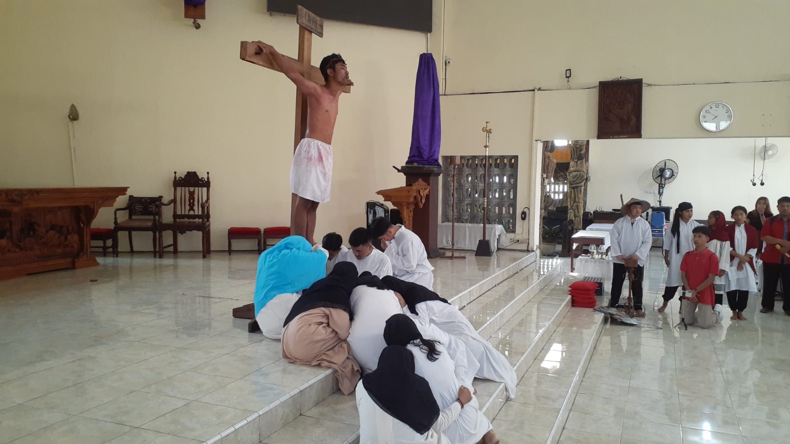 “Kami dari gereja Santo Pius X Blora, hari ini menampilkan visualisasi Jalan Salib, yaitu peristiwa penyaliban Tuhan Yesus. Kali ini divisualisasi di sekitar gereja dan di dalam gereja. Para pemain adalah anak-anak remaja Katolik, anak muda Katolik juga dibantu oleh anggota Komsos dan para orang tua,” jelas Romo Benediktus Prima Novianto Saputro, setelah acara visualissasi Jalan Salib.