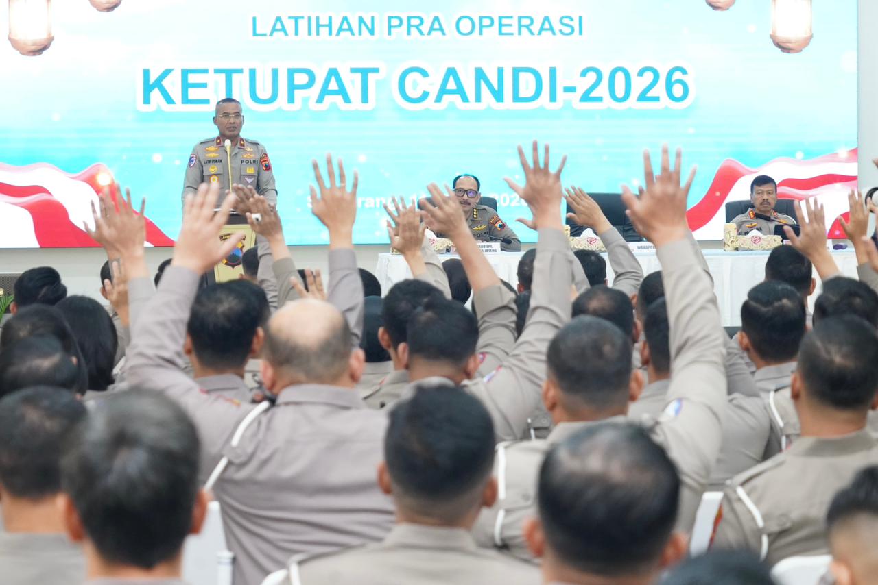 Semarang- Kepolisian Daerah Jawa Tengah mematangkan kesiapan pengamanan Hari Raya Idul Fitri 1447 H melalui kegiatan Latihan Pra Operasi (Lat Pra Ops) Terpusat dengan sandi “Ketupat Candi 2026”. Kegiatan yang digelar di Gedung Borobudur Mapolda Jawa Tengah pada Rabu (11/3/2026) tersebut dipimpin langsung oleh Wakapolda Jawa Tengah, Brigjen. Pol. Dr. Latif Usman, S.I.K., M. Hum didampingi Karo Ops, Dirlantas, Kabidhumas, serta dihadiri para Pejabat Utama Polda Jateng dan pejabat utama Polres jajaran.