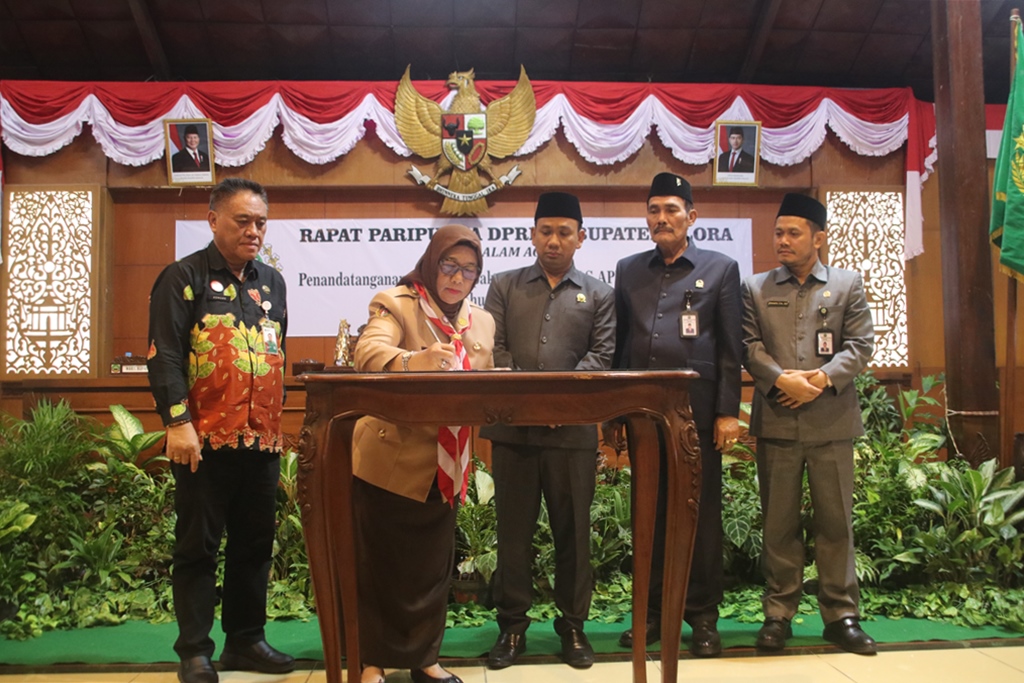 Penandatanganan dilakukan melalui rapat paripurna yang dipimpin oleh Ketua DPRD Blora Mustopa, S.Pd.I., didampingi unsur pimpinan DPRD di ruang pertemuan DPRD Blora, Kamis (14/8/2025).